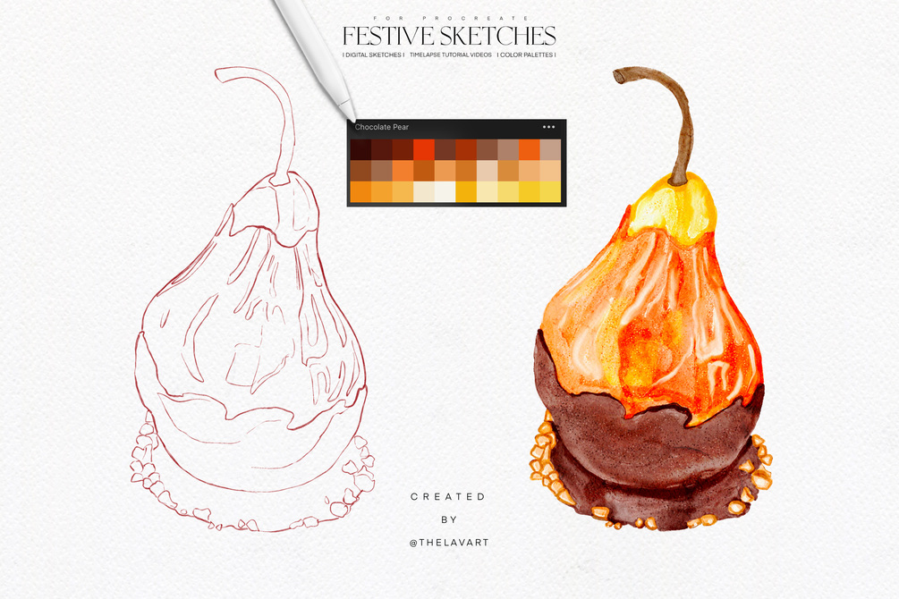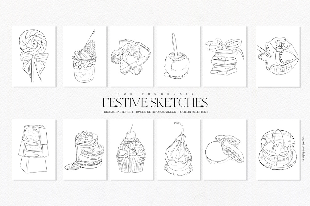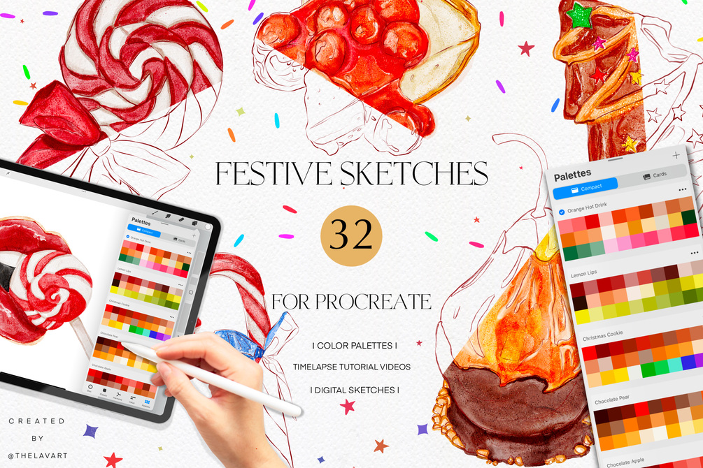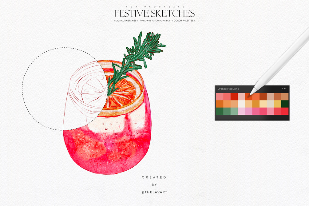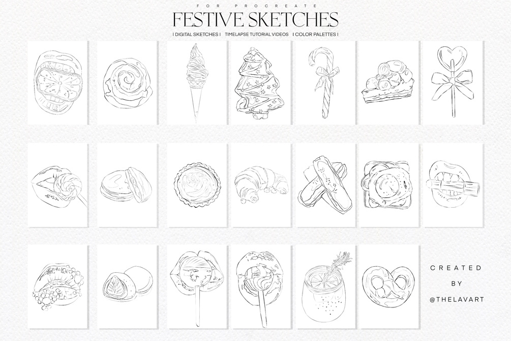 Festive Sketches & Color Palettes for Procreate is a collection features a variety of digital sketches, color palettes and short timelapse videos. This collection is perfect for practicing art techniques in a fun relaxing way, whether you're a beginner or an experienced artist.