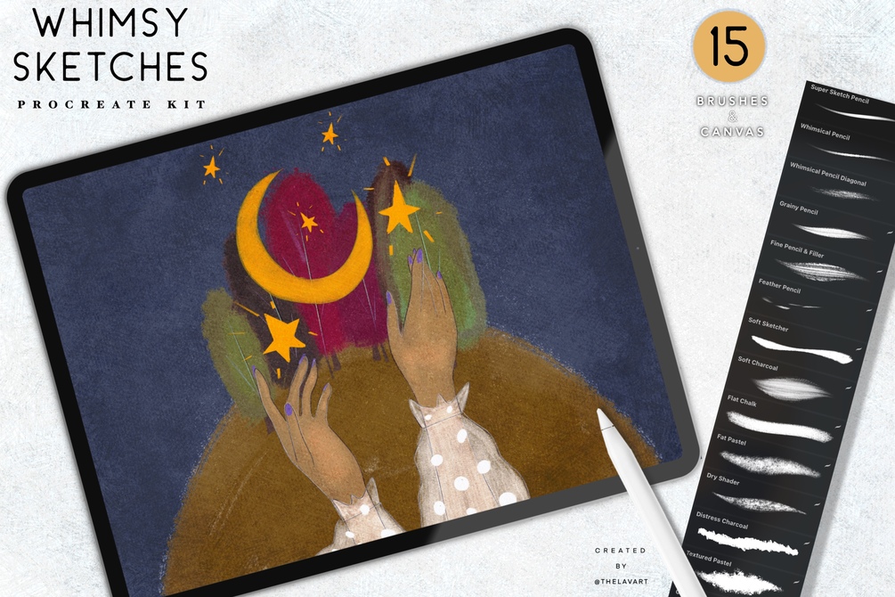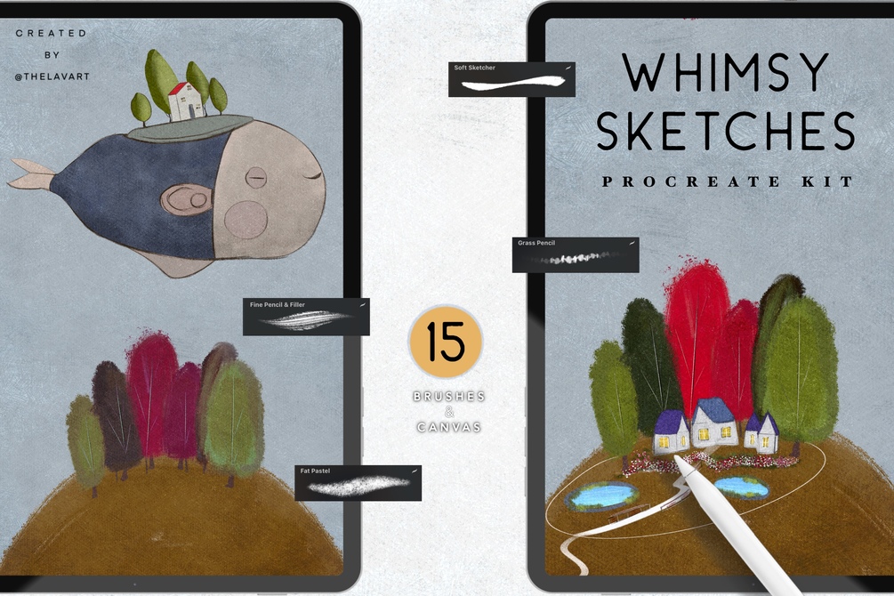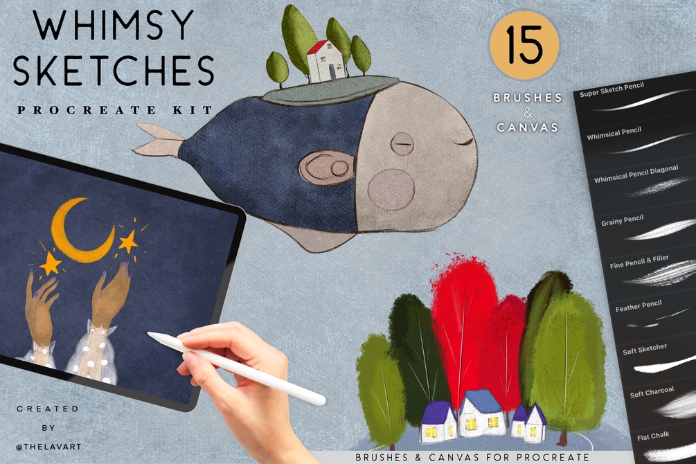 Whimsical Sketch brush set for Procreate includes 15 carefully crafted brushes designed for artists who love creating fairytale, storybook-style illustrations. This set offers everything you need to bring a whimsical touch to your sketches and finished artwork and bring soft, storybook feel to your digital illustrations.