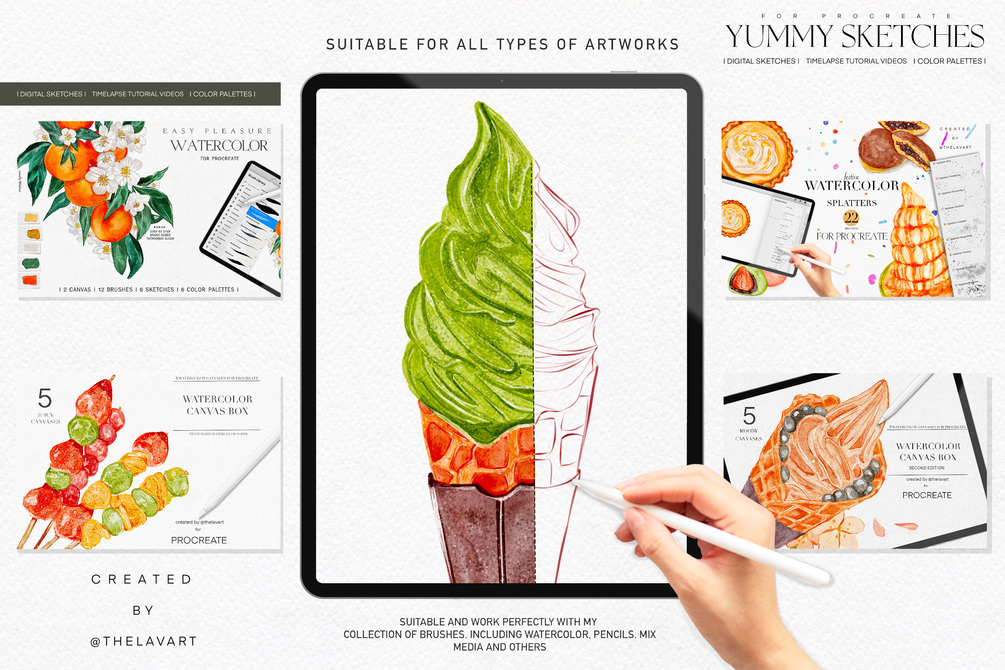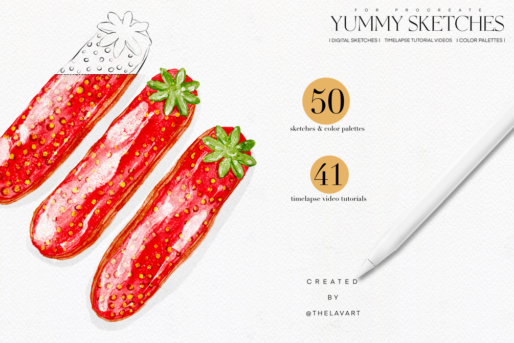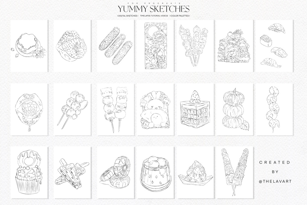 Yummy Sketches & Color Palettes for Procreate is a collection features a variety of digital sketches, color palettes and short video tutorials. This collection is perfect for practicing art techniques in a fun relaxing way, whether you're a beginner or an experienced artist.