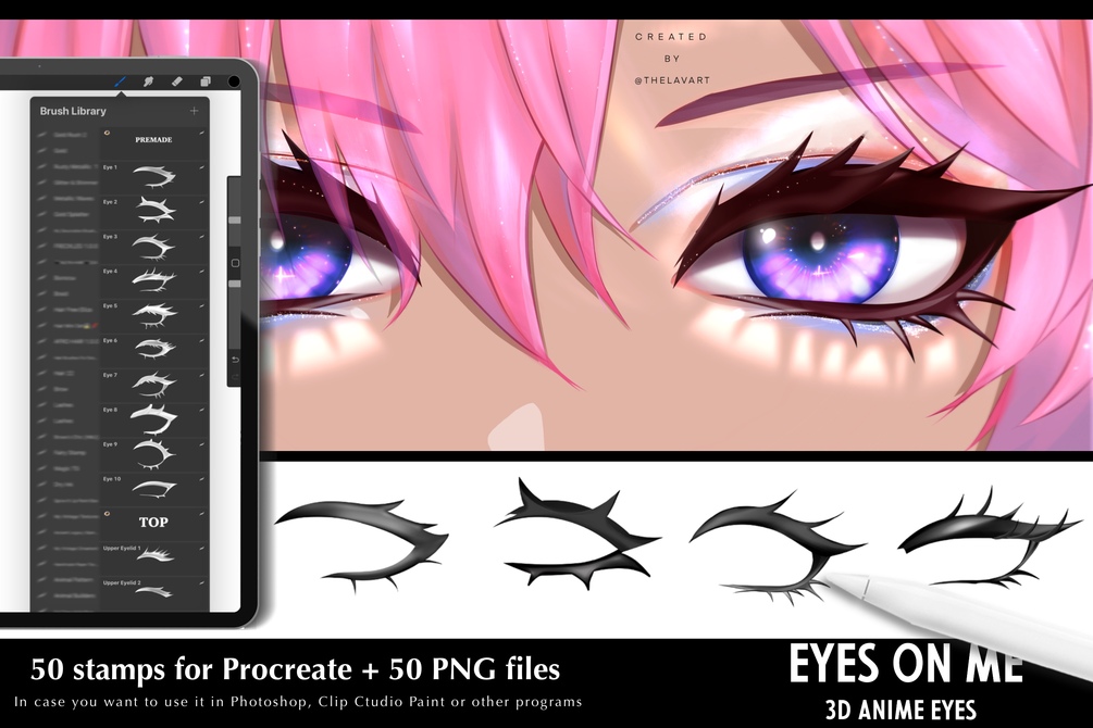 10 Premade Anime Eye Brushes 15 Upper Lid Brushes 10 Lower Lid Brushes 15 Extension Add-On Brushes - for customizing and adding extra details to your eyes
