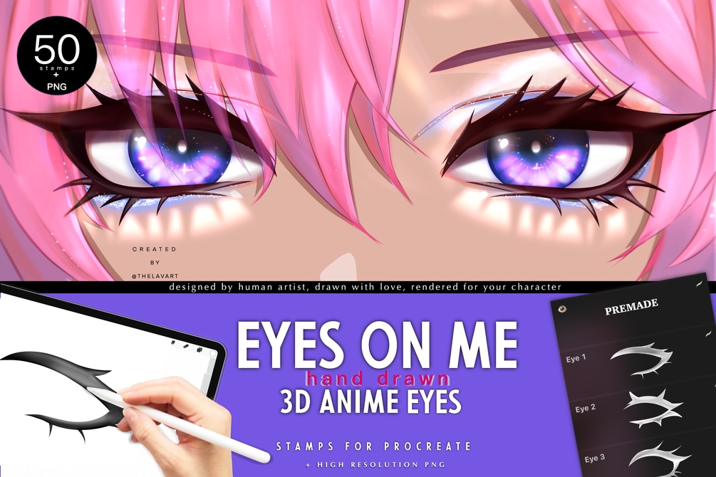 Eyes on Me - Anime Eye brush pack - designed for anime and character art enthusiasts! This pack includes 50 hand-drawn stamps, each crafted with love and precision to give your characters stunning eyes.