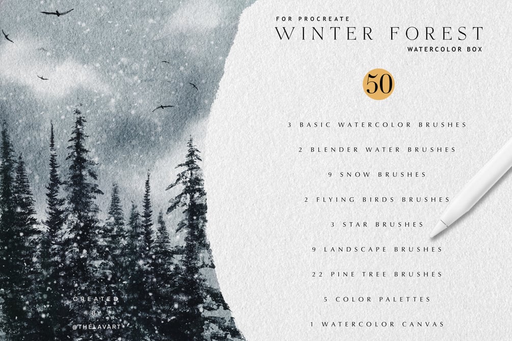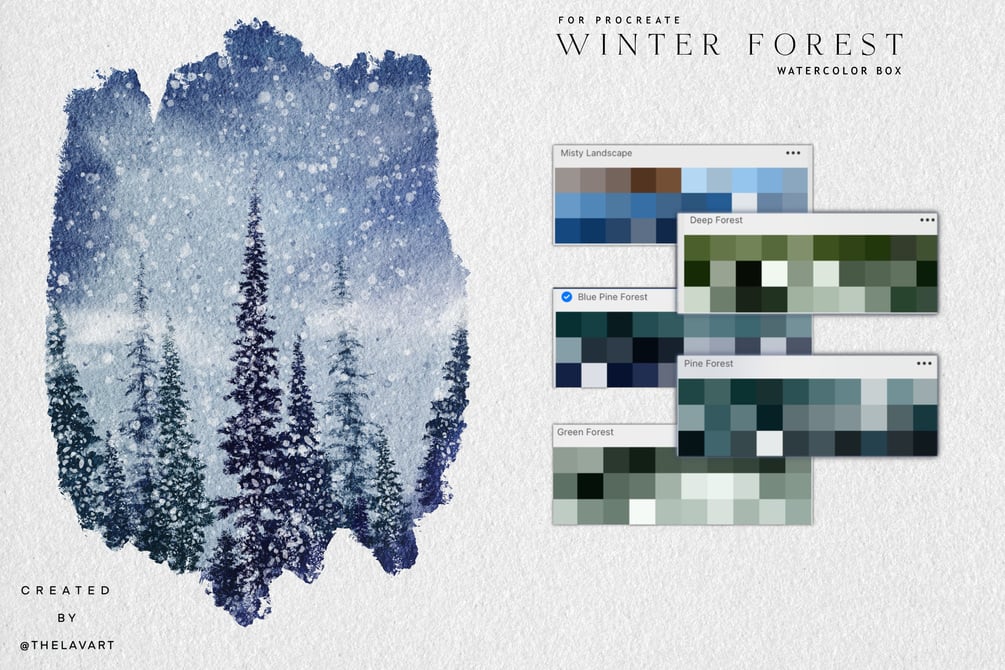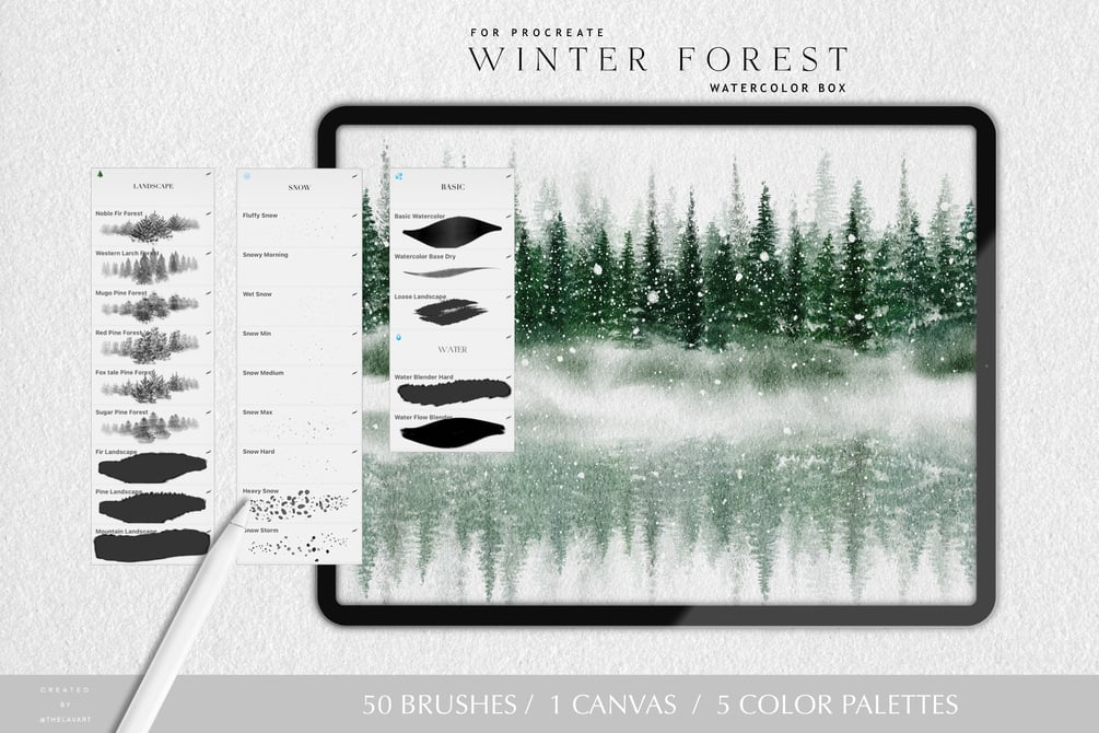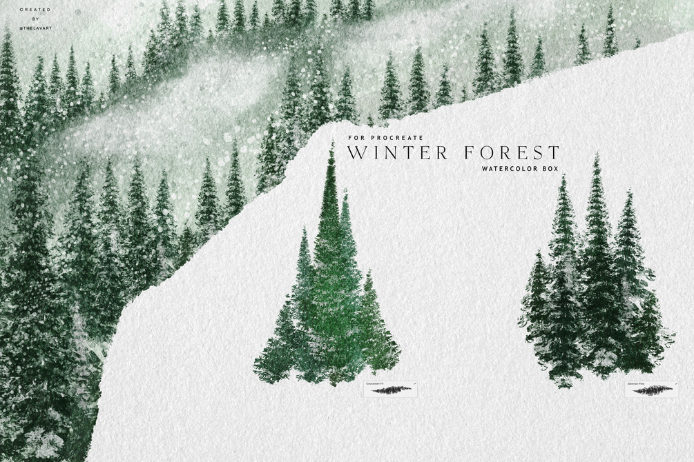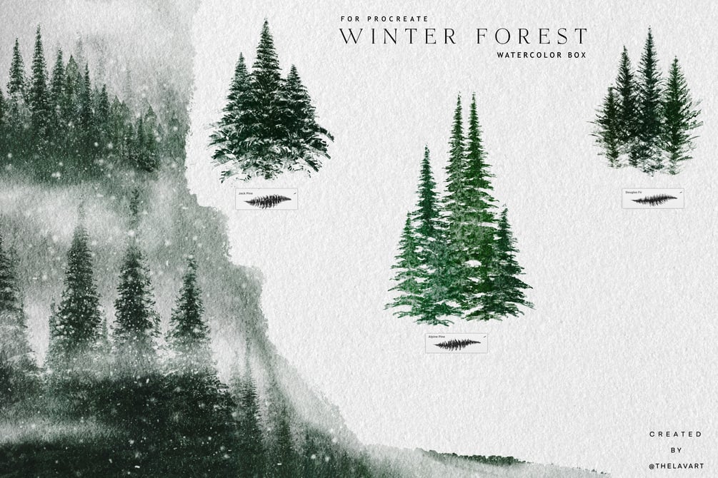 Winter Forest Landscape Watercolor Brush box for Procreate include variety of brushes to bring your winter scenes to life - landscape brushes, pine tree brushes, snow brushes, star brrushes, color palettes and more. Whether you're painting snowy forests, frosty mountains, or tranquil winter skies, these brushes offer the texture and depth you need for stunning, realistic results.