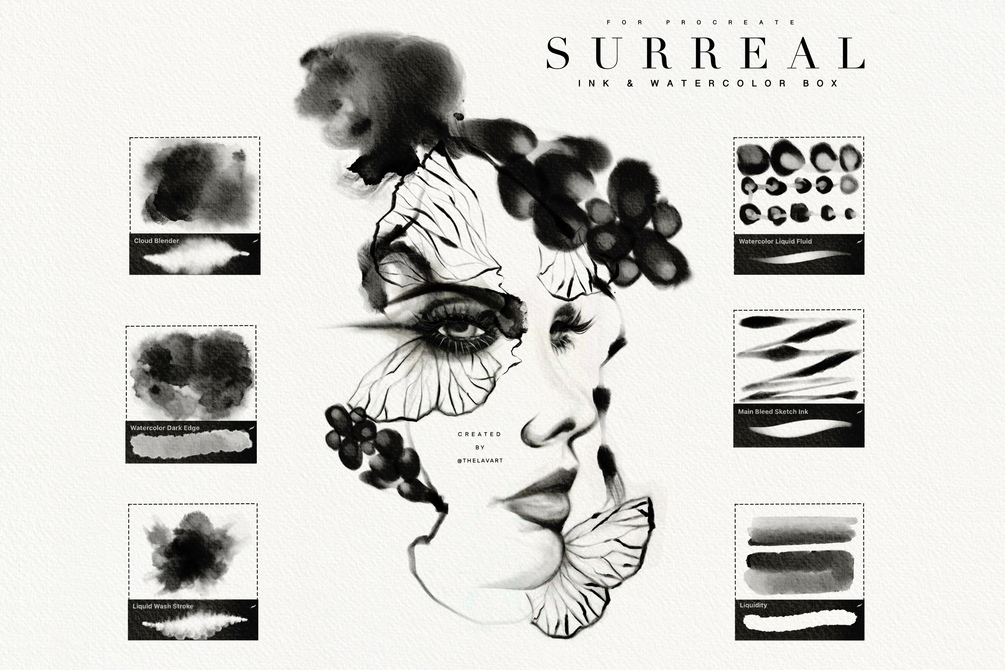 This bundle includes 22 unique brushes and one custom canvas, each designed to give your artwork a wide range of dynamic textures and effects. From smooth, flowing washes to expressive, splattered ink, these brushes are perfect for creating stunning surreal and abstract compositions.