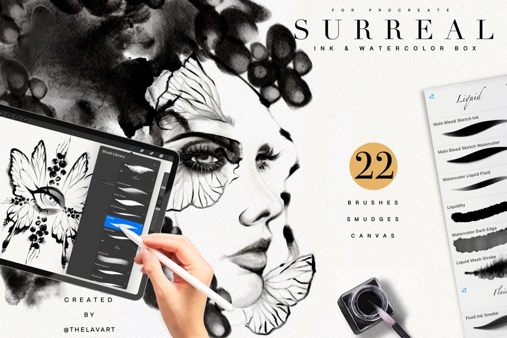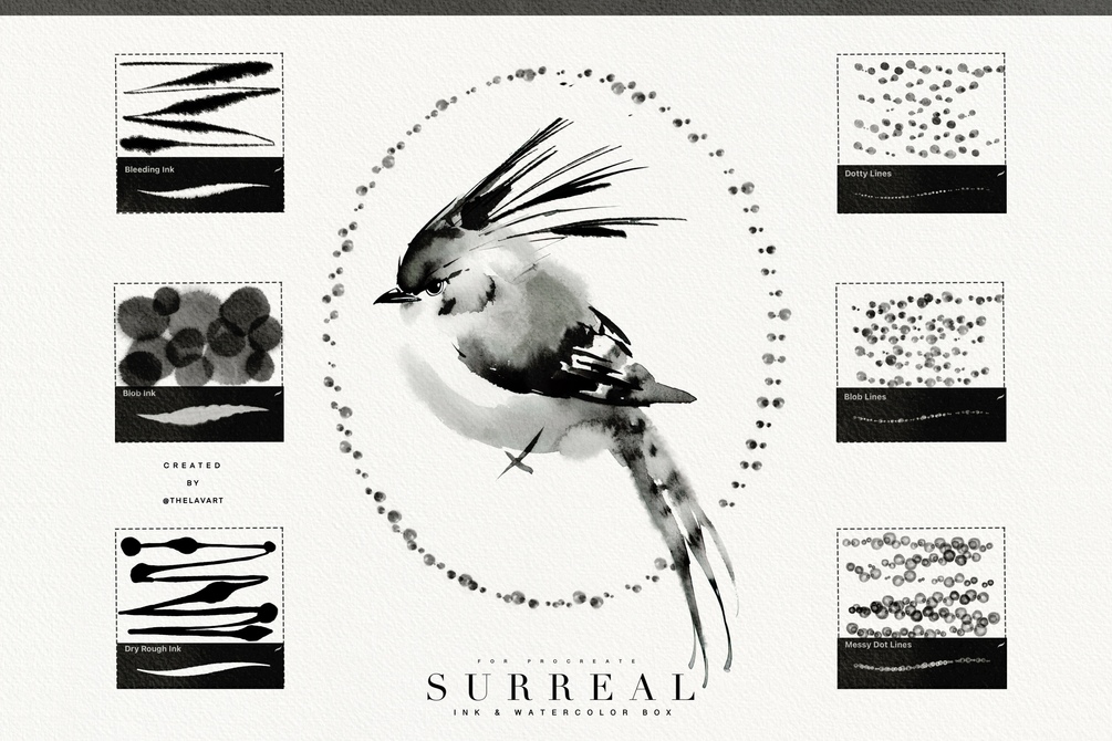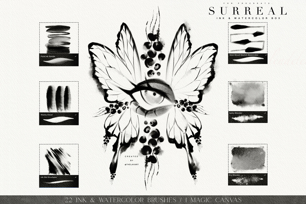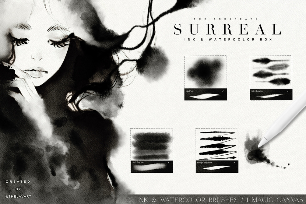 This bundle includes 22 unique brushes and one custom canvas, each designed to give your artwork a wide range of dynamic textures and effects. From smooth, flowing washes to expressive, splattered ink, these brushes are perfect for creating stunning surreal and abstract compositions.