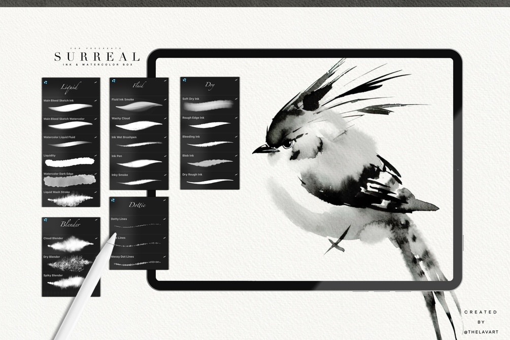 Unlock your creative potential with this versatile collection of Ink & Watercolor brushes for Procreate, designed specifically for abstract and surreal painting. Whether you're exploring fluid, organic forms or intricate, detailed textures, these brushes will help you bring your imaginative visions to life.
